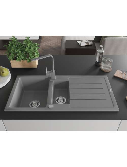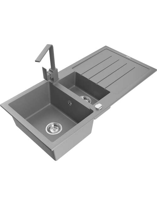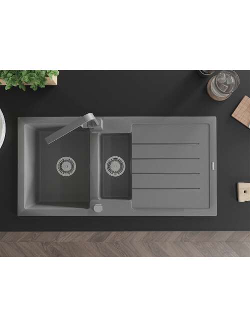 Dane techniczne: Zlewozmywak: Rozmiar: 1000x500x200 mm Głębokość komory: 190 mm (większa), 115 mm (mniejsza) Wymiary komory: 430x330 mm (większa), 340x170 mm (mniejsza) Średnica odpływu: ø90 mm Typ: 1,5-komorowy z ociekaczem Rodzaj: Wpuszczany w blat Kolor: Szary Wykończenie syfonu: Chrom Materiał: Granit (80% kruszywo granitowe 20% żywice) Otwór przelewowy: Tak Otwory: ( bateria, automat ) 2 Montaż: Uniwersalny, możliwość montażu z ociekaczem po lewej lub prawej stronie Wysoka odporność na zarysowania i przebarwienia Odporność na szok termiczny Powierzchnia ułatwiająca czyszczenie Dwa dodatkowe podfrezowane otwory do samodzielnego wybicia ø35 Bateria kuchenna: Materiał: Mosiądz Kolor: Szary Głowica: Ceramiczna Perlator: Tak Typ: Jednouchwytowa Wysokość baterii: 290 mm Zasięg wylewki: 220 mm |