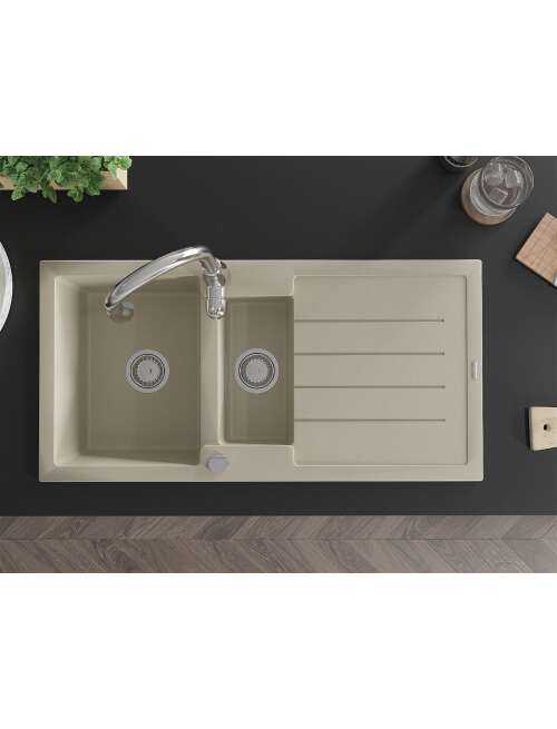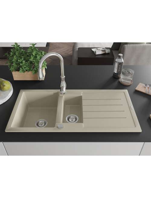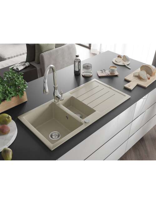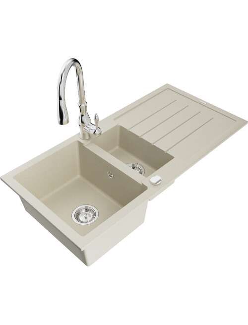 Dane techniczne: Zlewozmywak: Rozmiar: 1000x500x200 mm Głębokość komory: 190 mm (większa), 115 mm (mniejsza) Wymiary komory: 430x330 mm (większa), 340x170 mm (mniejsza) Średnica odpływu: ø90 mm Typ: 1,5-komorowy z ociekaczem Rodzaj: Wpuszczany w blat Kolor: Beżowy Wykończenie syfonu: Chrom Materiał: Granit (80% kruszywo granitowe 20% żywice) Otwór przelewowy: Tak Otwory: ( bateria, automat ) 2 Montaż: Uniwersalny, możliwość montażu z ociekaczem po lewej lub prawej stronie Wysoka odporność na zarysowania i przebarwienia Odporność na szok termiczny Powierzchnia ułatwiająca czyszczenie Dwa dodatkowe podfrezowane otwory do samodzielnego wybicia ø35 Bateria kuchenna: Materiał: Mosiądz Kolor: Chrom Głowica: Ceramiczna Perlator: Tak Typ: Jednouchwytowa Wysokość baterii: 410 mm Zasięg wylewki: 231 mm |