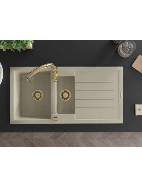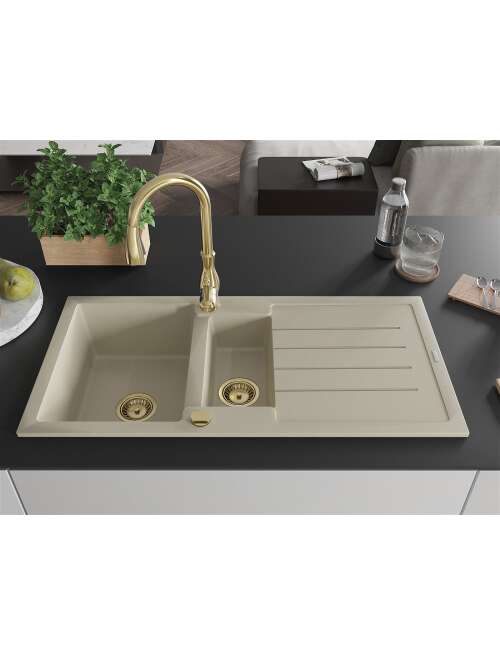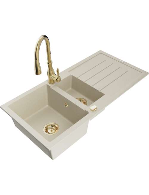Mexen Andres zlewozmywak granitowy 1,5-komorowy z ociekaczem i baterią kuchenną Savita, beżowy - 6515-69-672601-50