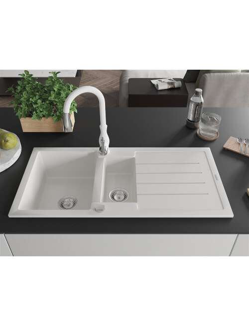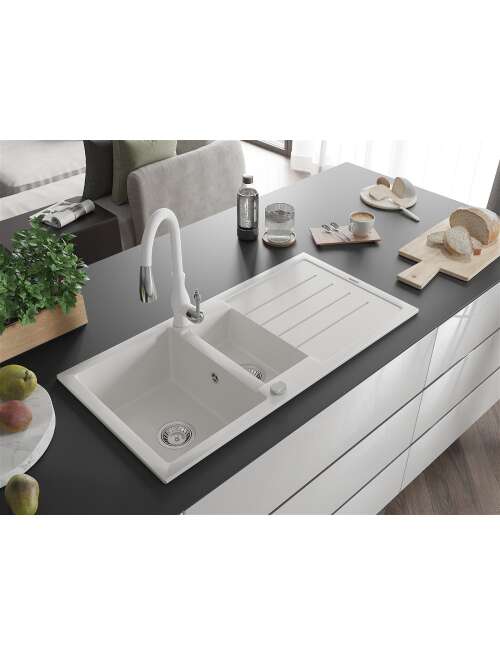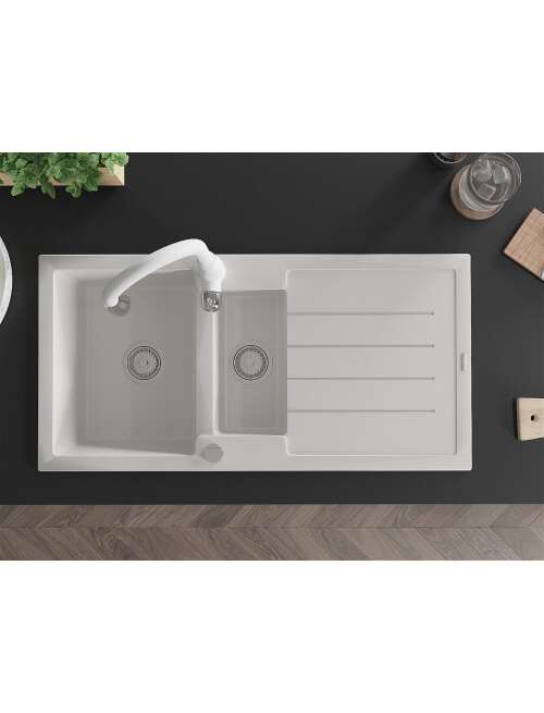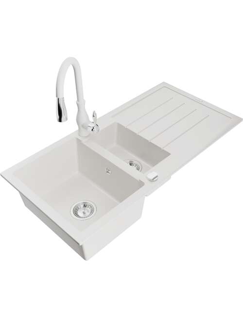Dane techniczne: Zlewozmywak: Rozmiar: 1000x500x200 mm Głębokość komory: 190 mm (większa), 115 mm (mniejsza) Wymiary komory: 430x330 mm (większa), 340x170 mm (mniejsza) Średnica odpływu: ø90 mm Typ: 1,5-komorowy z ociekaczem Rodzaj: Wpuszczany w blat Kolor: Biały Wykończenie syfonu: Chrom Materiał: Granit (80% kruszywo granitowe 20% żywice) Otwór przelewowy: Tak Otwory: ( bateria, automat ) 2 Montaż: Uniwersalny, możliwość montażu z ociekaczem po lewej lub prawej stronie Wysoka odporność na zarysowania i przebarwienia Odporność na szok termiczny Powierzchnia ułatwiająca czyszczenie Dwa dodatkowe podfrezowane otwory do samodzielnego wybicia ø35 Bateria kuchenna: Materiał: Mosiądz Kolor: Biały Głowica: Ceramiczna Perlator: Tak Typ: Jednouchwytowa Wysokość baterii: 410 mm Zasięg wylewki: 231 mm |