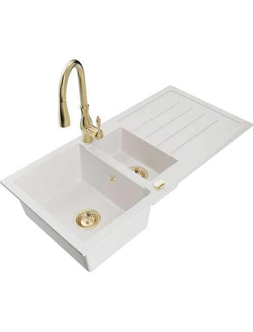 Dane techniczne: Zlewozmywak: Rozmiar: 1000x500x200 mm Głębokość komory: 190 mm (większa), 115 mm (mniejsza) Wymiary komory: 430x330 mm (większa), 340x170 mm (mniejsza) Średnica odpływu: ø90 mm Typ: 1,5-komorowy z ociekaczem Rodzaj: Wpuszczany w blat Kolor: Biały Wykończenie syfonu: Złoty Materiał: Granit (80% kruszywo granitowe 20% żywice) Otwór przelewowy: Tak Otwory: ( bateria, automat ) 2 Montaż: Uniwersalny, możliwość montażu z ociekaczem po lewej lub prawej stronie Wysoka odporność na zarysowania i przebarwienia Odporność na szok termiczny Powierzchnia ułatwiająca czyszczenie Dwa dodatkowe podfrezowane otwory do samodzielnego wybicia ø35 Bateria kuchenna: Materiał: Mosiądz Kolor: Złoty Głowica: Ceramiczna Perlator: Tak Typ: Jednouchwytowa Wysokość baterii: 410 mm Zasięg wylewki: 231 mm |