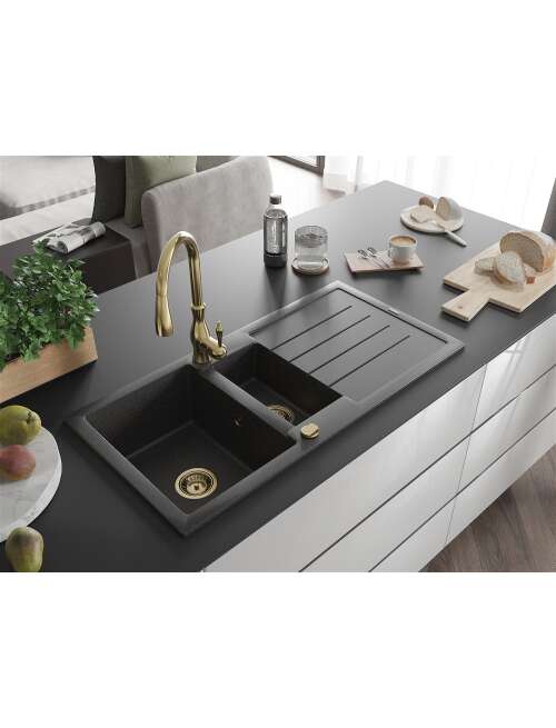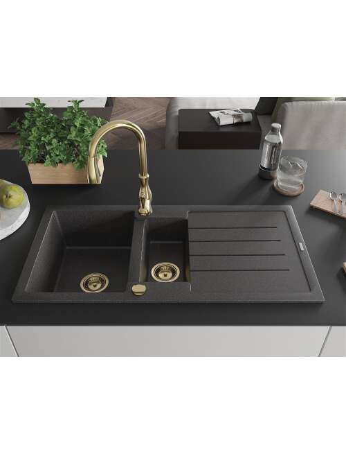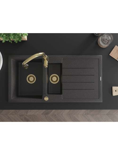 Dane techniczne: Zlewozmywak: Rozmiar: 1000x500x200 mm Głębokość komory: 190 mm (większa), 115 mm (mniejsza) Wymiary komory: 430x330 mm (większa), 340x170 mm (mniejsza) Średnica odpływu: ø90 mm Typ: 1,5-komorowy z ociekaczem Rodzaj: Wpuszczany w blat Kolor: Czarny nakrapiany Wykończenie syfonu: Złoty Materiał: Granit (80% kruszywo granitowe 20% żywice) Otwór przelewowy: Tak Otwory: ( bateria, automat ) 2 Montaż: Uniwersalny, możliwość montażu z ociekaczem po lewej lub prawej stronie Wysoka odporność na zarysowania i przebarwienia Odporność na szok termiczny Powierzchnia ułatwiająca czyszczenie Dwa dodatkowe podfrezowane otwory do samodzielnego wybicia ø35 Bateria kuchenna: Materiał: Mosiądz Kolor: Złoty Głowica: Ceramiczna Perlator: Tak Typ: Jednouchwytowa Wysokość baterii: 410 mm Zasięg wylewki: 231 mm |