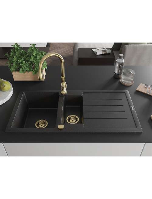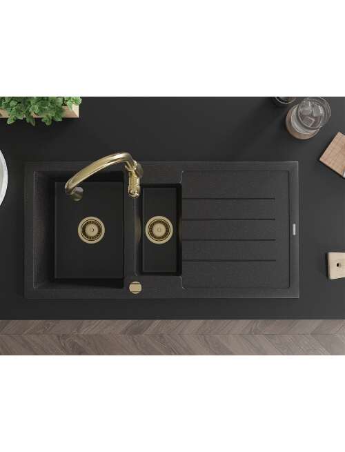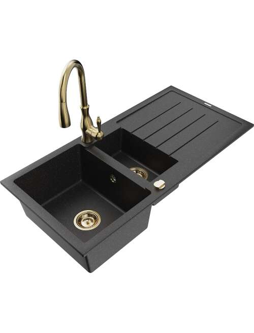 Mexen Andres zlewozmywak granitowy 1,5-komorowy z ociekaczem i baterią kuchenną Savita, czarny/srebrny - 6515-73-672601-50