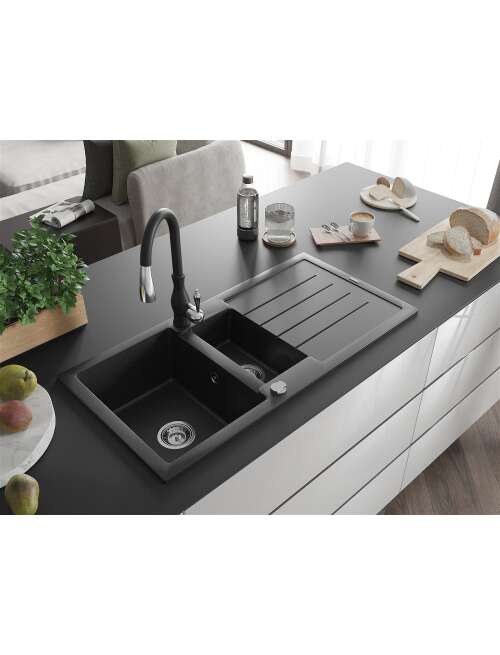 Mexen Andres zlewozmywak granitowy 1,5-komorowy z ociekaczem i baterią kuchenną Savita, czarny/srebrny - 6515-73-672601-70