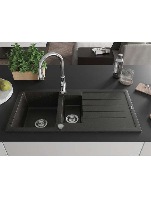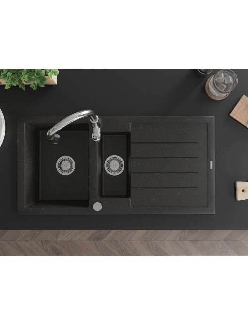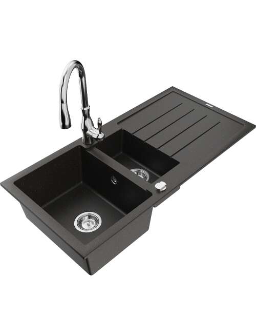 Mexen Andres zlewozmywak granitowy 1,5-komorowy z ociekaczem i baterią kuchenną Savita, czarny/złoty metalik- 6515-75-672601-00