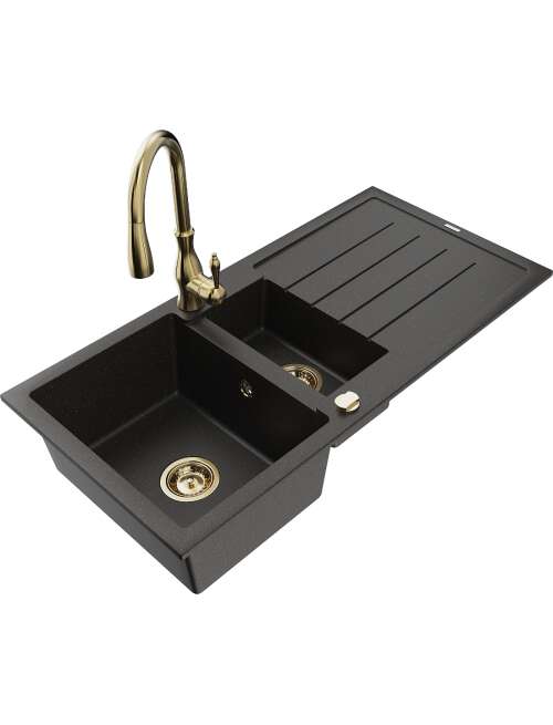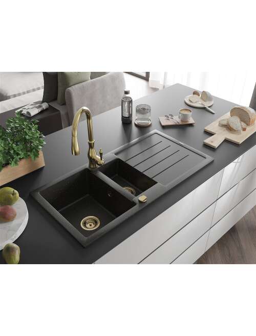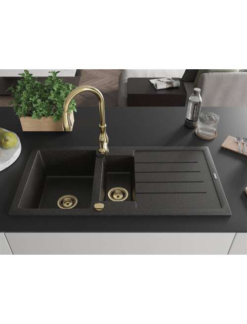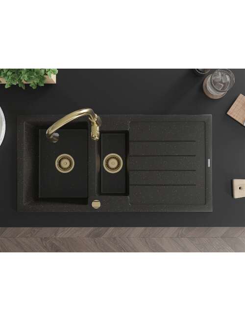 Dane techniczne: Zlewozmywak: Rozmiar: 1000x500x200 mm Głębokość komory: 190 mm (większa), 115 mm (mniejsza) Wymiary komory: 430x330 mm (większa), 340x170 mm (mniejsza) Średnica odpływu: ø90 mm Typ: 1,5-komorowy z ociekaczem Rodzaj: Wpuszczany w blat Kolor: Czarny/Złoty metalik Wykończenie syfonu: Złoty Materiał: Granit (80% kruszywo granitowe 20% żywice) Otwór przelewowy: Tak Otwory: ( bateria, automat ) 2 Montaż: Uniwersalny, możliwość montażu z ociekaczem po lewej lub prawej stronie Wysoka odporność na zarysowania i przebarwienia Odporność na szok termiczny Powierzchnia ułatwiająca czyszczenie Dwa dodatkowe podfrezowane otwory do samodzielnego wybicia ø35 Bateria kuchenna: Materiał: Mosiądz Kolor: Złoty Głowica: Ceramiczna Perlator: Tak Typ: Jednouchwytowa Wysokość baterii: 410 mm Zasięg wylewki: 231 mm |