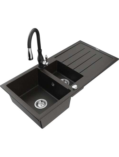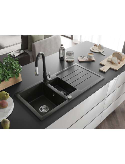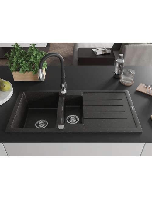 Dane techniczne: Zlewozmywak: Rozmiar: 1000x500x200 mm Głębokość komory: 190 mm (większa), 115 mm (mniejsza) Wymiary komory: 430x330 mm (większa), 340x170 mm (mniejsza) Średnica odpływu: ø90 mm Typ: 1,5-komorowy z ociekaczem Rodzaj: Wpuszczany w blat Kolor: Czarny/Złoty metalik Wykończenie syfonu: Chrom Materiał: Granit (80% kruszywo granitowe 20% żywice) Otwór przelewowy: Tak Otwory: ( bateria, automat ) 2 Montaż: Uniwersalny, możliwość montażu z ociekaczem po lewej lub prawej stronie Wysoka odporność na zarysowania i przebarwienia Odporność na szok termiczny Powierzchnia ułatwiająca czyszczenie Dwa dodatkowe podfrezowane otwory do samodzielnego wybicia ø35 Bateria kuchenna: Materiał: Mosiądz Kolor: Czarny Głowica: Ceramiczna Perlator: Tak Typ: Jednouchwytowa Wysokość baterii: 410 mm Zasięg wylewki: 231 mm |