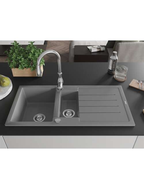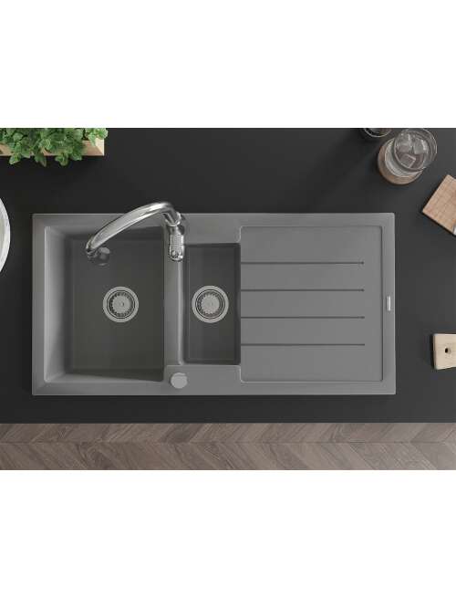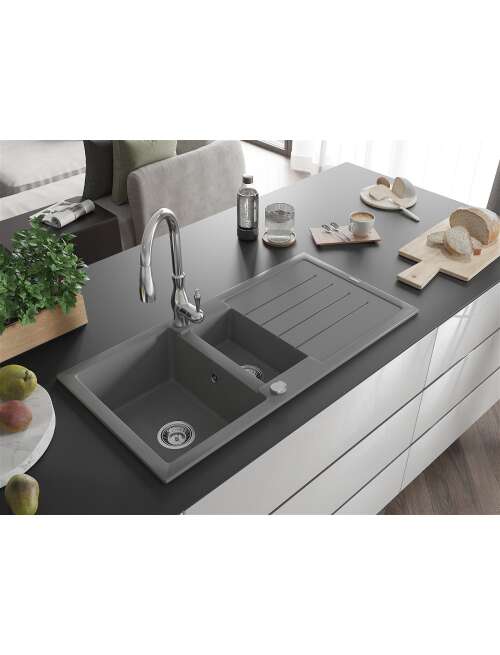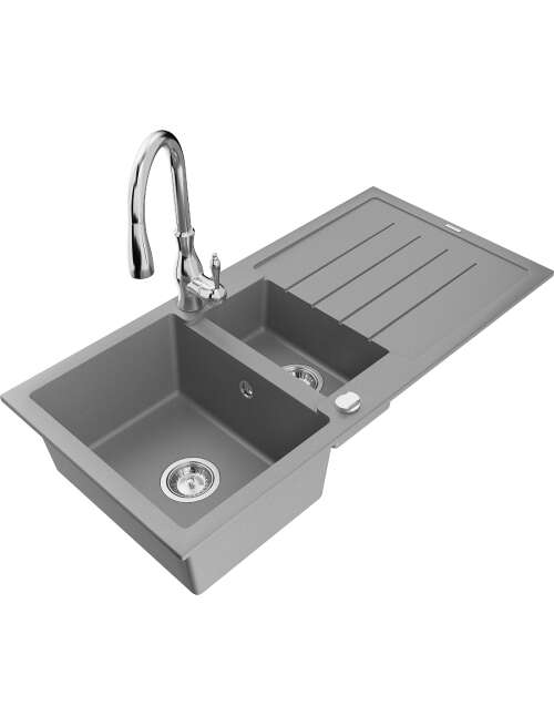 Mexen Andres zlewozmywak granitowy 1,5-komorowy z ociekaczem i baterią kuchenną Savita, szary - 6515-71-672601-00