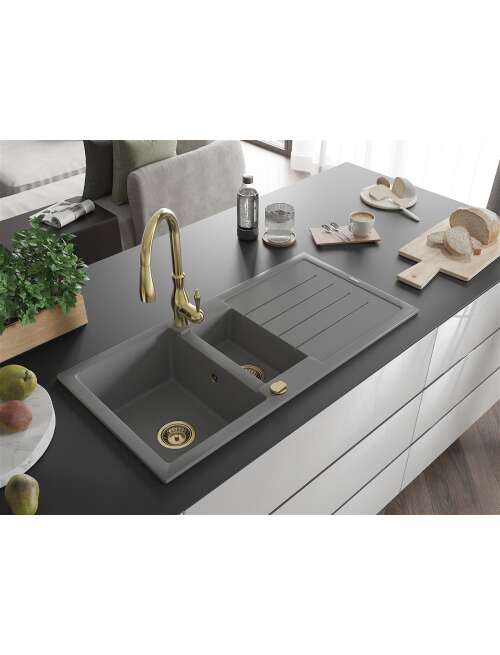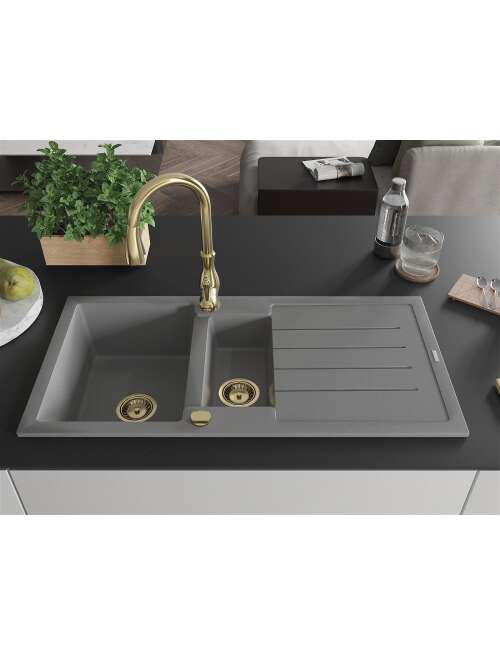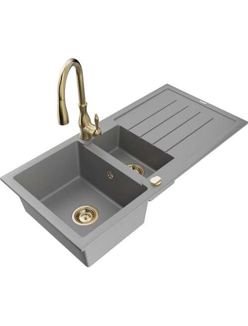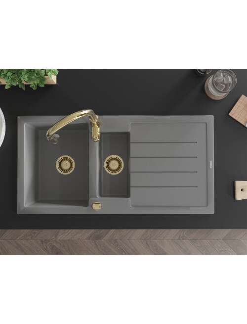 Dane techniczne: Zlewozmywak: Rozmiar: 1000x500x200 mm Głębokość komory: 190 mm (większa), 115 mm (mniejsza) Wymiary komory: 430x330 mm (większa), 340x170 mm (mniejsza) Średnica odpływu: ø90 mm Typ: 1,5-komorowy z ociekaczem Rodzaj: Wpuszczany w blat Kolor: Szary Wykończenie syfonu: Złoty Materiał: Granit (80% kruszywo granitowe 20% żywice) Otwór przelewowy: Tak Otwory: ( bateria, automat ) 2 Montaż: Uniwersalny, możliwość montażu z ociekaczem po lewej lub prawej stronie Wysoka odporność na zarysowania i przebarwienia Odporność na szok termiczny Powierzchnia ułatwiająca czyszczenie Dwa dodatkowe podfrezowane otwory do samodzielnego wybicia ø35 Bateria kuchenna: Materiał: Mosiądz Kolor: Złoty Głowica: Ceramiczna Perlator: Tak Typ: Jednouchwytowa Wysokość baterii: 410 mm Zasięg wylewki: 231 mm |