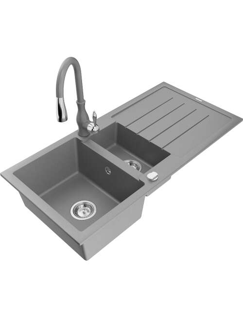 Mexen Andres zlewozmywak granitowy 1,5-komorowy z ociekaczem i baterią kuchenną Savita, szary - 6515-71-672601-71