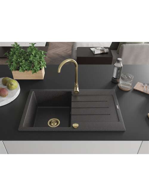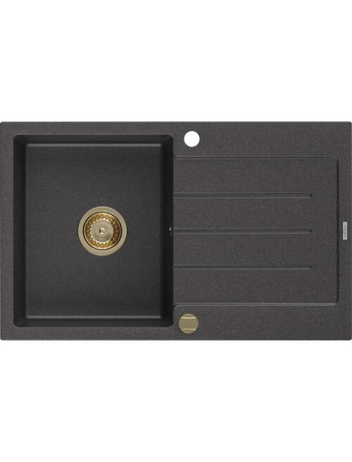 Dane techniczne: Rozmiar: 795x495x200 mm Głębokość komory: 200 mm Wymiary komory: 440x360 mm Średnica odpływu: ø90 mm Rodzaj: 1-komorowy z ociekaczem Typ: Wpuszczany w blat Materiał: Granit Kolor: Czarny nakrapiany Wykończenie syfonu: Złoty Otwór przelewowy: Tak Otwór na baterie: Tak Syfon automatyczny w komplecie Wysoka odporność na zarysowania i przebarwienia Odporność na szok termiczny Powierzchnia ułatwiająca czyszczenie Dwa dodatkowe podfrezowane otwory do samodzielnego wybicia ø35 |