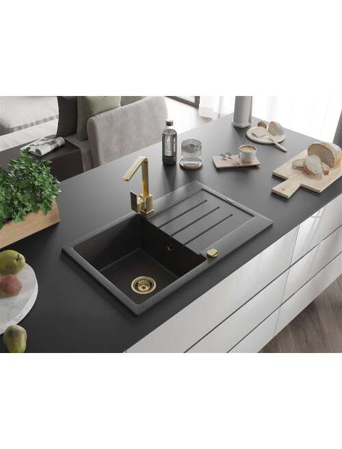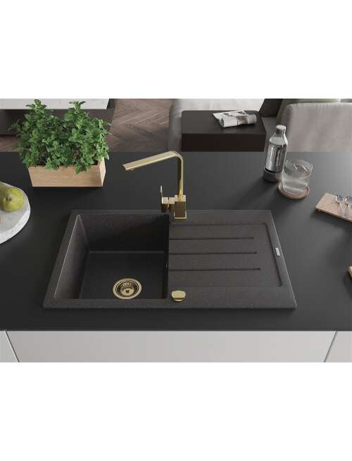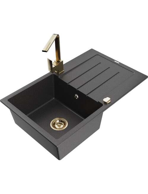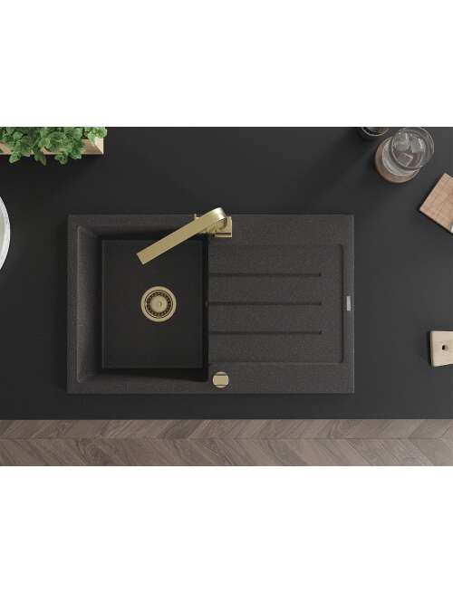 Dane techniczne: Zlewozmywak: Rozmiar: 795x495x200 mm Głębokość komory: 200 mm Wymiary komory: 440x360 mm Średnica odpływu: ø90 mm Typ: 1-komorowy z ociekaczem Rodzaj: Wpuszczany w blat Kolor: Czarny nakrapiany Wykończenie syfonu: Złoty Materiał: Granit (80% kruszywo granitowe 20% żywice) Otwór przelewowy: Tak Otwory: ( bateria, automat ) 2 Montaż: Uniwersalny, możliwość montażu z ociekaczem po lewej lub prawej stronie Wysoka odporność na zarysowania i przebarwienia Odporność na szok termiczny Powierzchnia ułatwiająca czyszczenie Dwa dodatkowe podfrezowane otwory do samodzielnego wybicia ø35 Bateria kuchenna: Materiał: Mosiądz Kolor: Złoty Głowica: Ceramiczna Perlator: Tak Typ: Jednouchwytowa Wysokość baterii: 290 mm Zasięg wylewki: 220 mm |