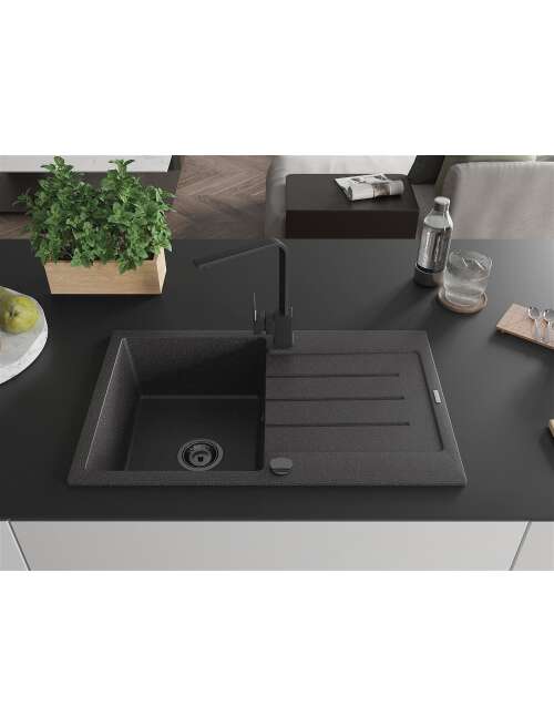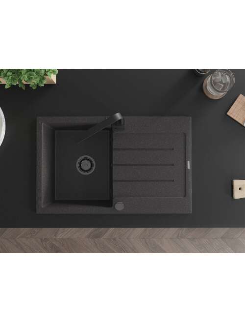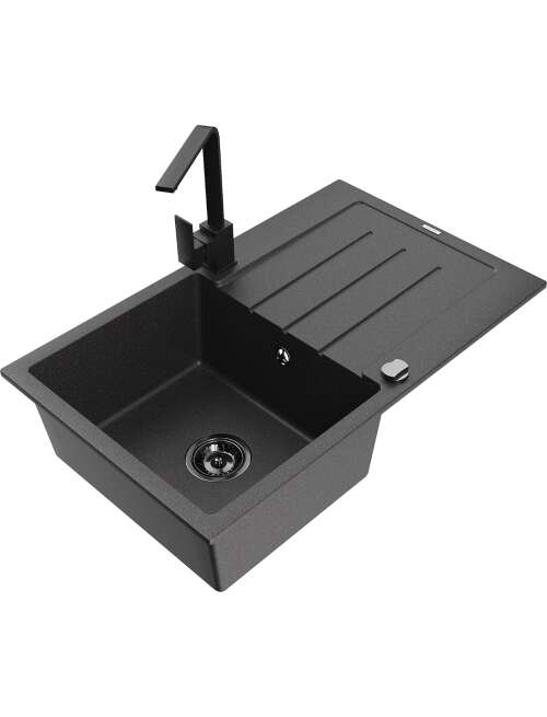 Mexen Bruno zlewozmywak granitowy 1-komorowy z ociekaczem i baterią kuchenną Rita, czarny nakrapiany - 6513-76-670300-70-B