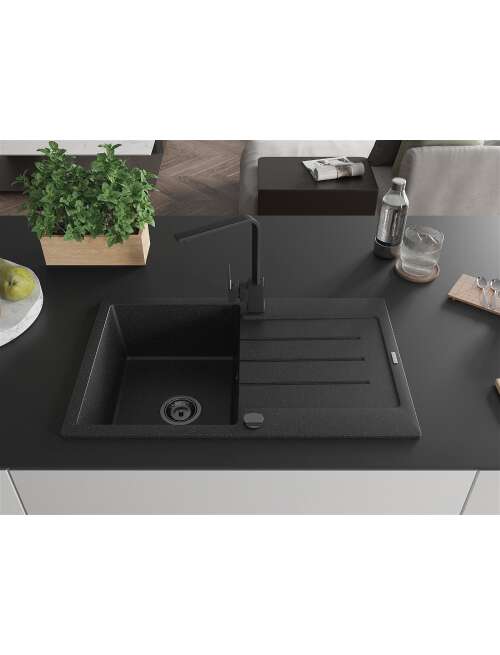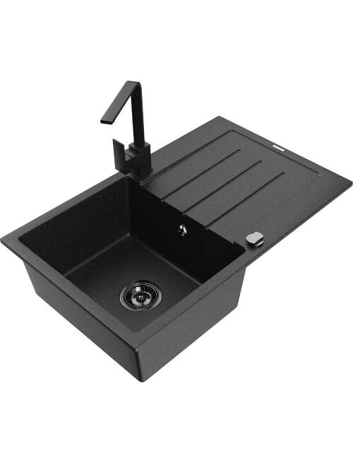 Mexen Bruno zlewozmywak granitowy 1-komorowy z ociekaczem i baterią kuchenną Rita, czarny/srebrny metalik - 6513-73-670300-70-B