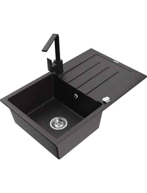 Dane techniczne: Zlewozmywak: Rozmiar: 795x495x200 mm Głębokość komory: 200 mm Wymiary komory: 440x360 mm Średnica odpływu: ø90 mm Typ: 1-komorowy z ociekaczem Rodzaj: Wpuszczany w blat Kolor: Czarny/Złoty metalik Wykończenie syfonu: Chrom Materiał: Granit (80% kruszywo granitowe 20% żywice) Otwór przelewowy: Tak Otwory: ( bateria, automat ) 2 Montaż: Uniwersalny, możliwość montażu z ociekaczem po lewej lub prawej stronie Wysoka odporność na zarysowania i przebarwienia Odporność na szok termiczny Powierzchnia ułatwiająca czyszczenie Dwa dodatkowe podfrezowane otwory do samodzielnego wybicia ø35 Bateria kuchenna: Materiał: Mosiądz Kolor: Czarny Głowica: Ceramiczna Perlator: Tak Typ: Jednouchwytowa Wysokość baterii: 290 mm Zasięg wylewki: 220 mm |
