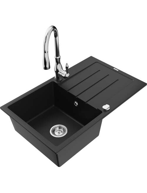 Mexen Bruno zlewozmywak granitowy 1-komorowy z ociekaczem i baterią kuchenną Savita, czarny - 6513-77-672601-00