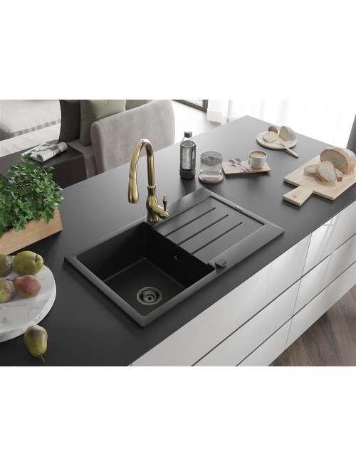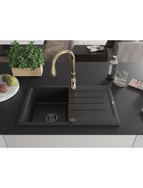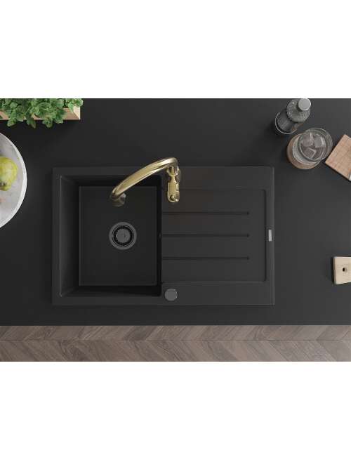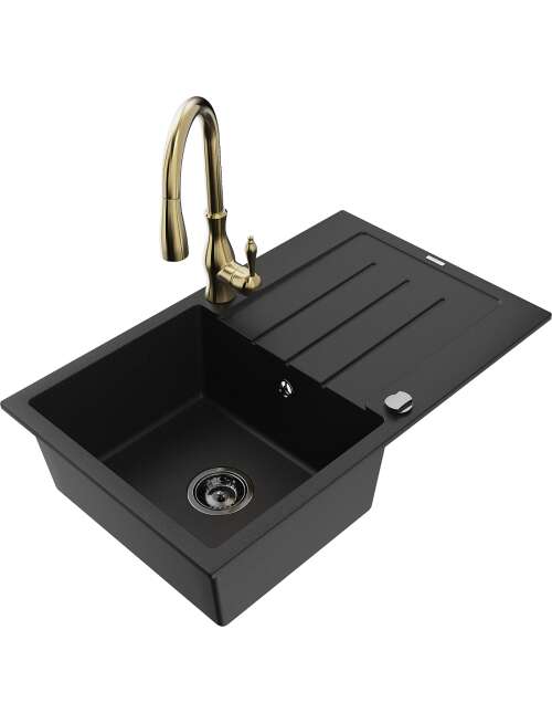 Dane techniczne: Zlewozmywak: Rozmiar: 795x495x200 mm Głębokość komory: 200 mm Wymiary komory: 440x360 mm Średnica odpływu: ø90 mm Typ: 1-komorowy z ociekaczem Rodzaj: Wpuszczany w blat Kolor: Czarny Wykończenie syfonu: Czarny Materiał: Granit (80% kruszywo granitowe 20% żywice) Otwór przelewowy: Tak Otwory: ( bateria, automat ) 2 Montaż: Uniwersalny, możliwość montażu z ociekaczem po lewej lub prawej stronie Wysoka odporność na zarysowania i przebarwienia Odporność na szok termiczny Powierzchnia ułatwiająca czyszczenie Dwa dodatkowe podfrezowane otwory do samodzielnego wybicia ø35 Bateria kuchenna: Materiał: Mosiądz Kolor: Złoty Głowica: Ceramiczna Perlator: Tak Typ: Jednouchwytowa Wysokość baterii: 410 mm Zasięg wylewki: 231 mm |