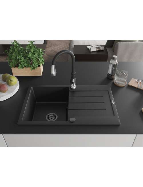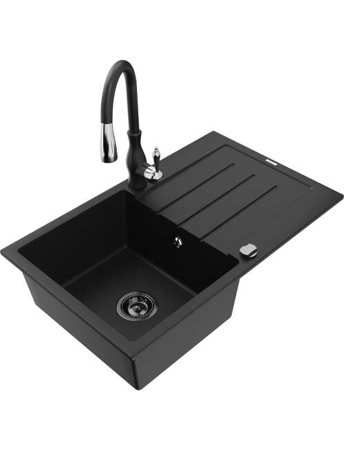 Mexen Bruno zlewozmywak granitowy 1-komorowy z ociekaczem i baterią kuchenną Savita, czarny - 6513-77-672601-70-B