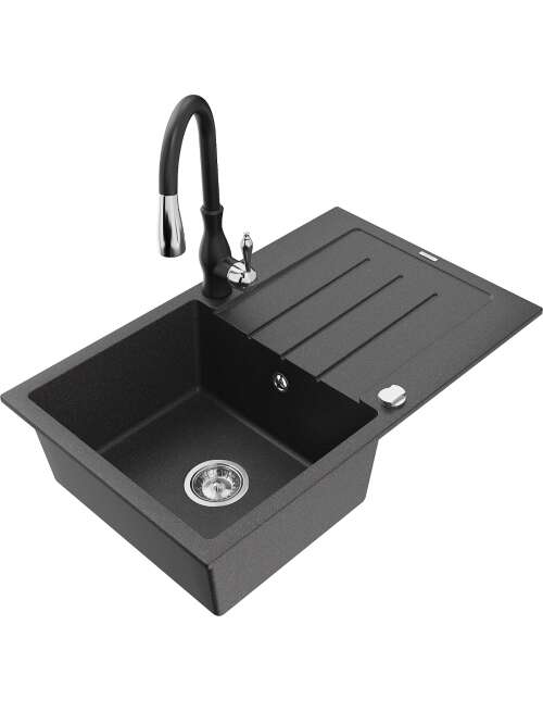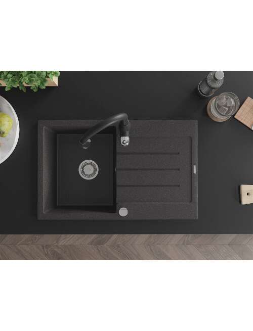 Dane techniczne: Zlewozmywak: Rozmiar: 795x495x200 mm Głębokość komory: 200 mm Wymiary komory: 440x360 mm Średnica odpływu: ø90 mm Typ: 1-komorowy z ociekaczem Rodzaj: Wpuszczany w blat Kolor: Czarny nakrapiany Wykończenie syfonu: Chrom Materiał: Granit (80% kruszywo granitowe 20% żywice) Otwór przelewowy: Tak Otwory: ( bateria, automat ) 2 Montaż: Uniwersalny, możliwość montażu z ociekaczem po lewej lub prawej stronie Wysoka odporność na zarysowania i przebarwienia Odporność na szok termiczny Powierzchnia ułatwiająca czyszczenie Dwa dodatkowe podfrezowane otwory do samodzielnego wybicia ø35 Bateria kuchenna: Materiał: Mosiądz Kolor: Czarny Głowica: Ceramiczna Perlator: Tak Typ: Jednouchwytowa Wysokość baterii: 410 mm Zasięg wylewki: 231 mm |