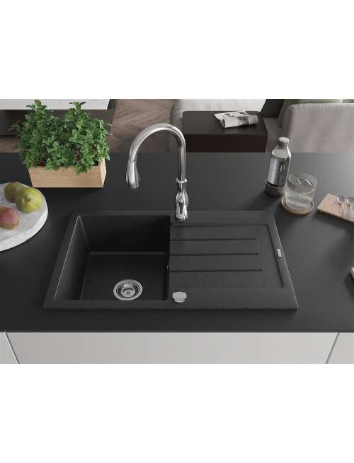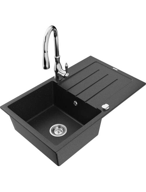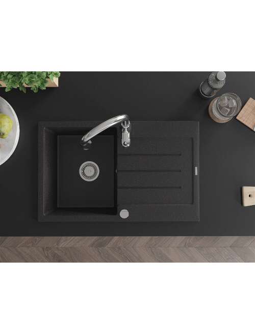 Dane techniczne: Zlewozmywak: Rozmiar: 795x495x200 mm Głębokość komory: 200 mm Wymiary komory: 440x360 mm Średnica odpływu: ø90 mm Typ: 1-komorowy z ociekaczem Rodzaj: Wpuszczany w blat Kolor: Czarny/Srebrny metalik Wykończenie syfonu: Chrom Materiał: Granit (80% kruszywo granitowe 20% żywice) Otwór przelewowy: Tak Otwory: ( bateria, automat ) 2 Montaż: Uniwersalny, możliwość montażu z ociekaczem po lewej lub prawej stronie Wysoka odporność na zarysowania i przebarwienia Odporność na szok termiczny Powierzchnia ułatwiająca czyszczenie Dwa dodatkowe podfrezowane otwory do samodzielnego wybicia ø35 Bateria kuchenna: Materiał: Mosiądz Kolor: Chrom Głowica: Ceramiczna Perlator: Tak Typ: Jednouchwytowa Wysokość baterii: 410 mm Zasięg wylewki: 231 mm |