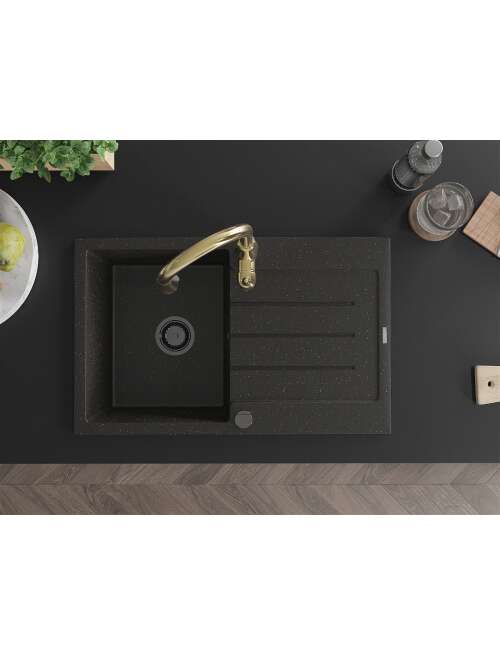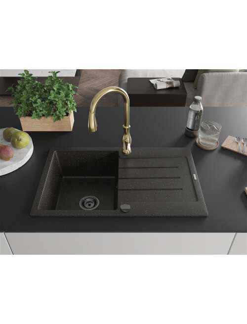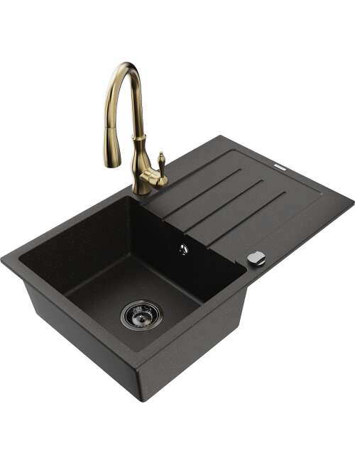 Mexen Bruno zlewozmywak granitowy 1-komorowy z ociekaczem i baterią kuchenną Savita, czarny/zloty metalik - 6513-75-672601-50-B