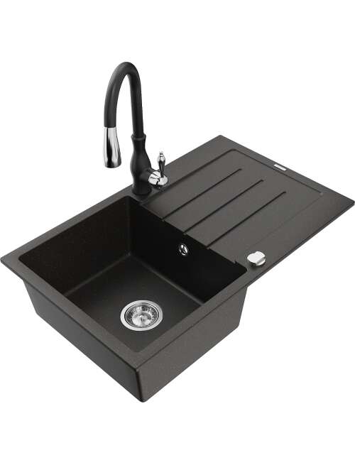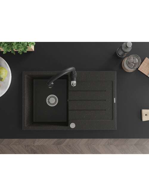 Dane techniczne: Zlewozmywak: Rozmiar: 795x495x200 mm Głębokość komory: 200 mm Wymiary komory: 440x360 mm Średnica odpływu: ø90 mm Typ: 1-komorowy z ociekaczem Rodzaj: Wpuszczany w blat Kolor: Czarny/Złoty metalik Wykończenie syfonu: Chrom Materiał: Granit (80% kruszywo granitowe 20% żywice) Otwór przelewowy: Tak Otwory: ( bateria, automat ) 2 Montaż: Uniwersalny, możliwość montażu z ociekaczem po lewej lub prawej stronie Wysoka odporność na zarysowania i przebarwienia Odporność na szok termiczny Powierzchnia ułatwiająca czyszczenie Dwa dodatkowe podfrezowane otwory do samodzielnego wybicia ø35 Bateria kuchenna: Materiał: Mosiądz Kolor: Czarny Głowica: Ceramiczna Perlator: Tak Typ: Jednouchwytowa Wysokość baterii: 410 mm Zasięg wylewki: 231 mm |