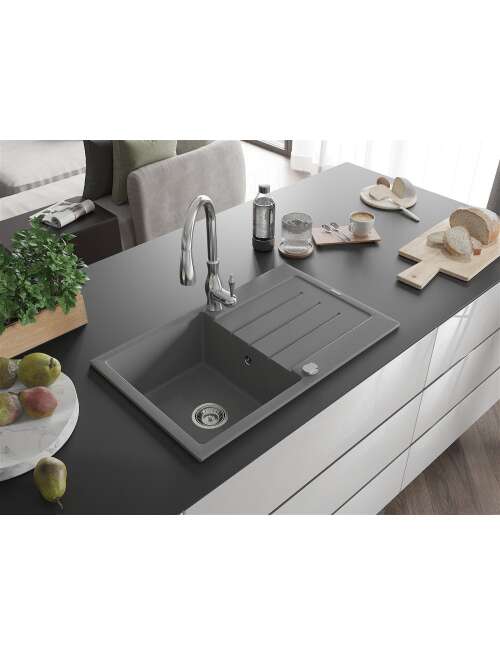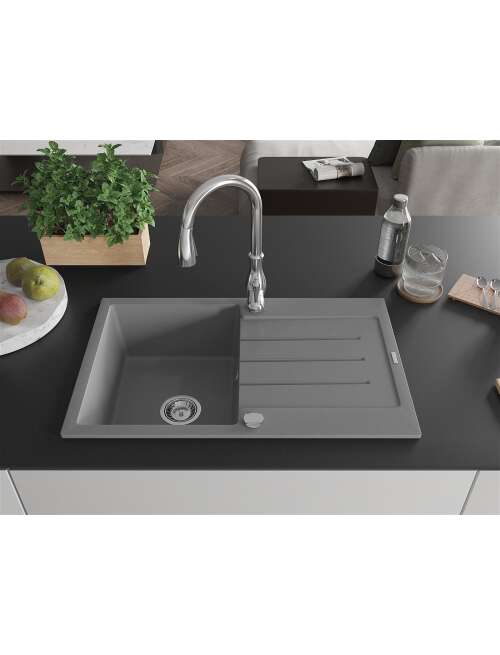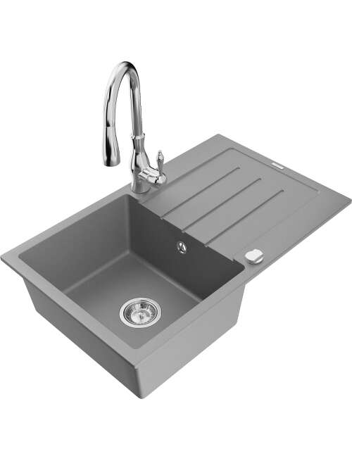Mexen Bruno zlewozmywak granitowy 1-komorowy z ociekaczem i baterią kuchenną Savita, szary - 6513-71-672601-00