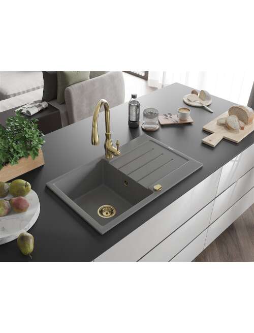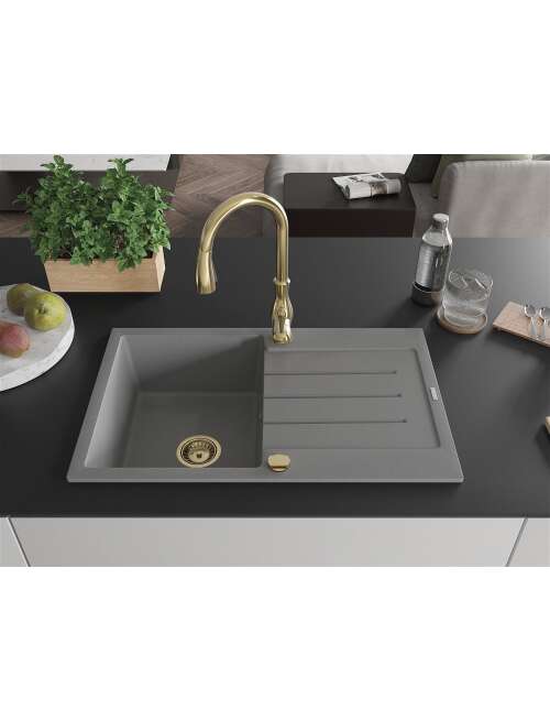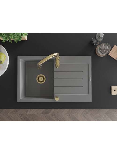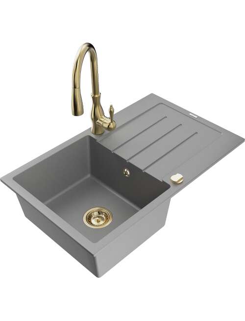 Mexen Bruno zlewozmywak granitowy 1-komorowy z ociekaczem i baterią kuchenną Savita, szary - 6513-71-672601-50