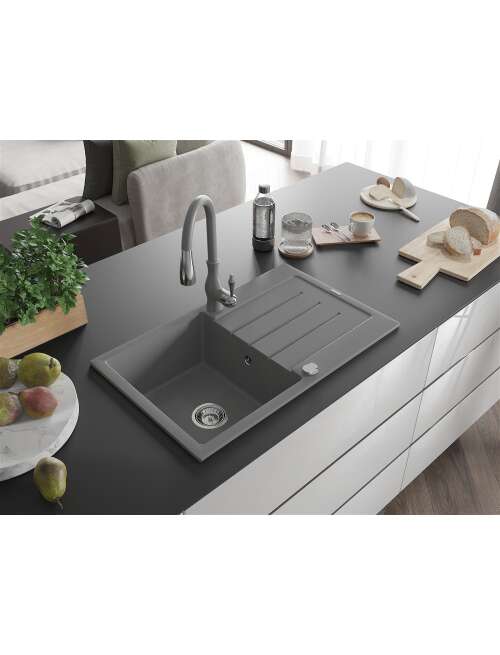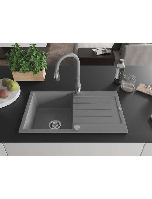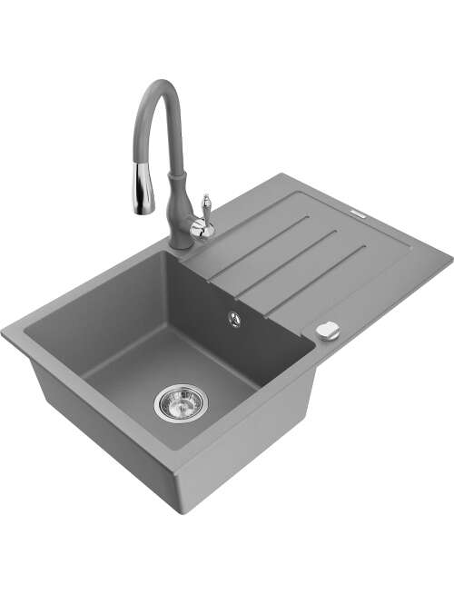 Mexen Bruno zlewozmywak granitowy 1-komorowy z ociekaczem i baterią kuchenną Savita, szary - 6513-71-672601-71