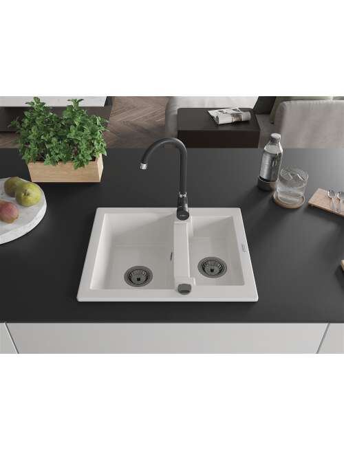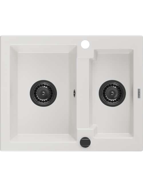 Dane techniczne: Rozmiar: 582x475x177 mm Głębokość komory: 162 mm (większa), 102 mm (mniejsza) Wymiary komory: 395x272 mm (większa), 375x182 mm (mniejsza) Średnica odpływu: ø90 mm Rodzaj: 1,5-komorowy Typ: Wpuszczany w blat Materiał: Granit Kolor: Biały Wykończenie syfonu: Czarny Otwór przelewowy: Tak Otwór na baterie: Tak Syfon automatyczny w komplecie Wysoka odporność na zarysowania i przebarwienia Odporność na szok termiczny Powierzchnia ułatwiająca czyszczenie |