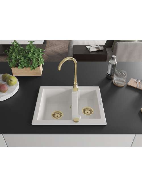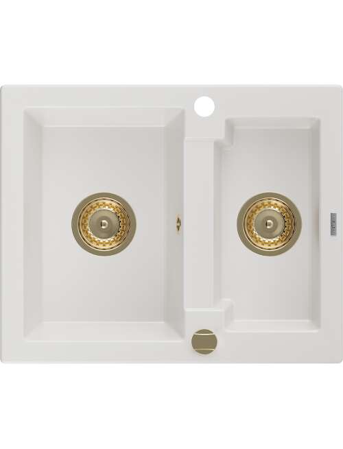 Mexen Carlos zlewozmywak granitowy 1,5-komorowy 582 x 475 mm, biały, syfon złoty - 6518581500-20-G
