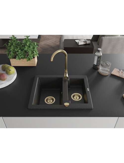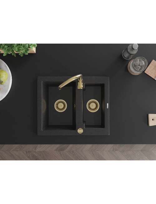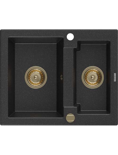 Mexen Carlos zlewozmywak granitowy 1,5-komorowy 582 x 475 mm, czarny/srebrny metalik, syfon złoty - 6518581500-73-G