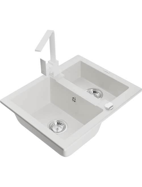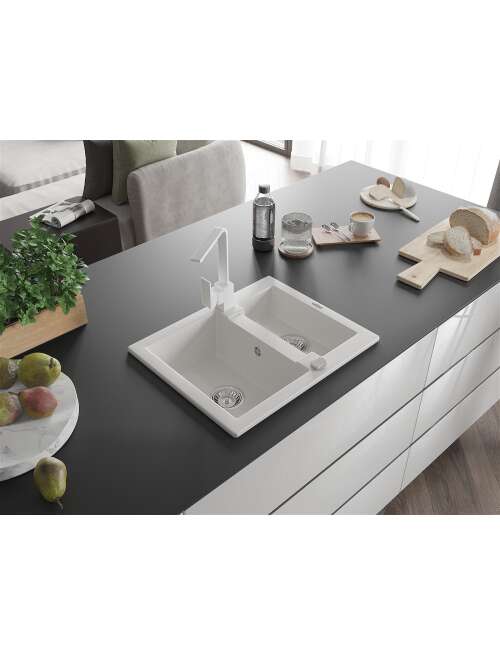 Dane techniczne: Zlewozmywak: Rozmiar: 582x475x177 mm Głębokość komory: 162 mm (większa), 102 mm (mniejsza) Wymiary komory: 395x272 mm (większa), 375x182 mm (mniejsza) Średnica odpływu: ø90 mm Typ: 1,5-komorowy Rodzaj: Wpuszczany w blat Kolor: Biały Wykończenie syfonu: Chrom Materiał: Granit (80% kruszywo granitowe 20% żywice) Otwór przelewowy: Tak Otwory: ( bateria, automat ) 2 Wysoka odporność na zarysowania i przebarwienia Odporność na szok termiczny Powierzchnia ułatwiająca czyszczenie Jeden dodatkowy podfrezowany otwór do samodzielnego wybicia ø35 Bateria kuchenna: Materiał: Mosiądz Kolor: Biały Głowica: Ceramiczna Perlator: Tak Typ: Jednouchwytowa Wysokość baterii: 290 mm Zasięg wylewki: 220 mm |