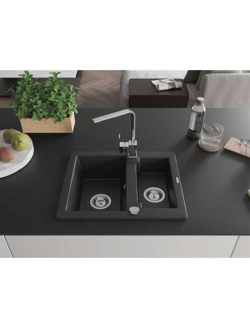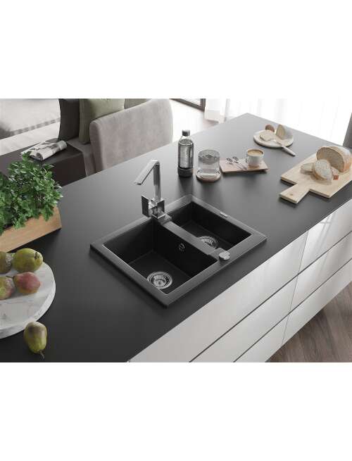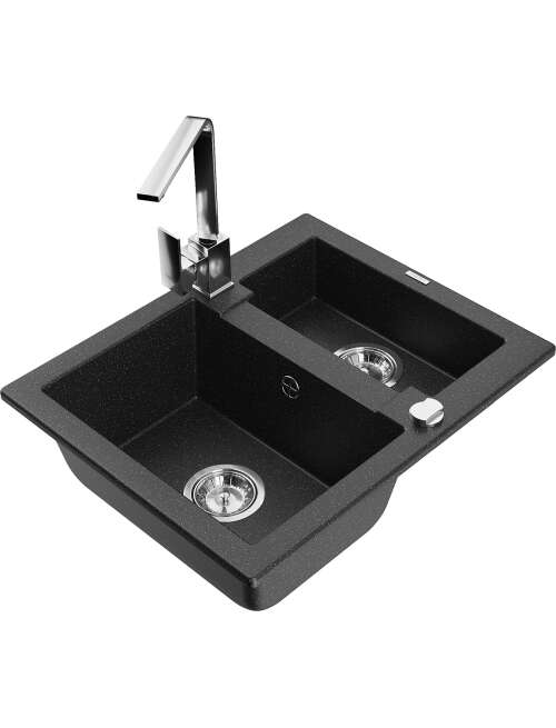 Dane techniczne: Zlewozmywak: Rozmiar: 582x475x177 mm Głębokość komory: 162 mm (większa), 102 mm (mniejsza) Wymiary komory: 395x272 mm (większa), 375x182 mm (mniejsza) Średnica odpływu: ø90 mm Typ: 1,5-komorowy Rodzaj: Wpuszczany w blat Kolor: Czarny/Srebrny metalik Wykończenie syfonu: Chrom Materiał: Granit (80% kruszywo granitowe 20% żywice) Otwór przelewowy: Tak Otwory: ( bateria, automat ) 2 Wysoka odporność na zarysowania i przebarwienia Odporność na szok termiczny Powierzchnia ułatwiająca czyszczenie Jeden dodatkowy podfrezowany otwór do samodzielnego wybicia ø35 Bateria kuchenna: Materiał: Mosiądz Kolor: Chrom Głowica: Ceramiczna Perlator: Tak Typ: Jednouchwytowa Wysokość baterii: 290 mm Zasięg wylewki: 220 mm |