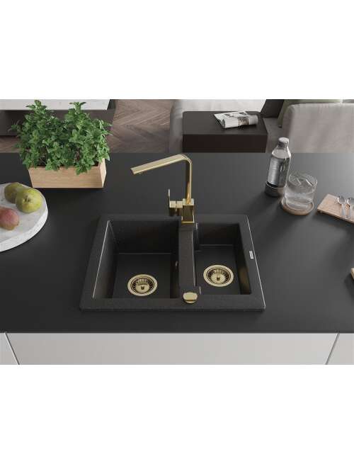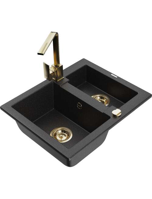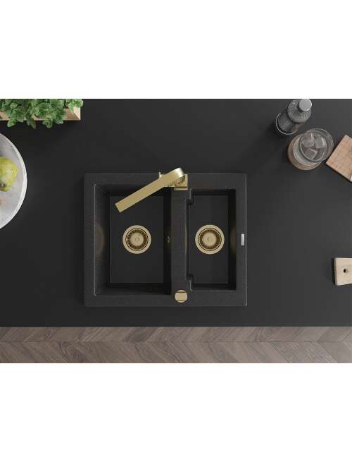 Dane techniczne: Zlewozmywak: Rozmiar: 582x475x177 mm Głębokość komory: 162 mm (większa), 102 mm (mniejsza) Wymiary komory: 395x272 mm (większa), 375x182 mm (mniejsza) Średnica odpływu: ø90 mm Typ: 1,5-komorowy Rodzaj: Wpuszczany w blat Kolor: Czarny/Srebrny metalik Wykończenie syfonu: Złoty Materiał: Granit (80% kruszywo granitowe 20% żywice) Otwór przelewowy: Tak Otwory: ( bateria, automat ) 2 Wysoka odporność na zarysowania i przebarwienia Odporność na szok termiczny Powierzchnia ułatwiająca czyszczenie Jeden dodatkowy podfrezowany otwór do samodzielnego wybicia ø35 Bateria kuchenna: Materiał: Mosiądz Kolor: Złoty Głowica: Ceramiczna Perlator: Tak Typ: Jednouchwytowa Wysokość baterii: 290 mm Zasięg wylewki: 220 mm |