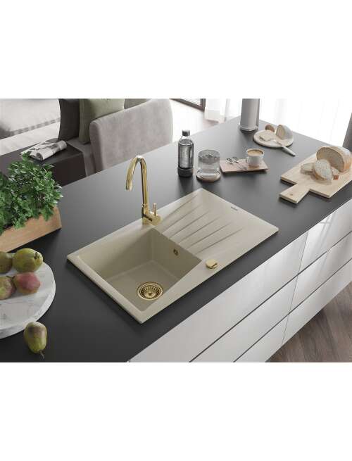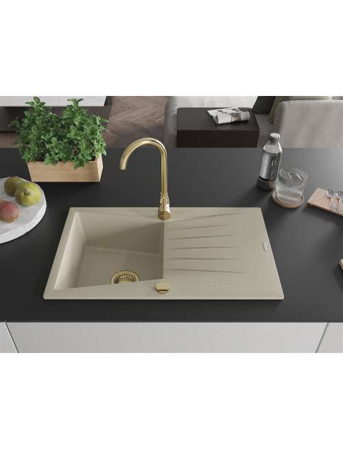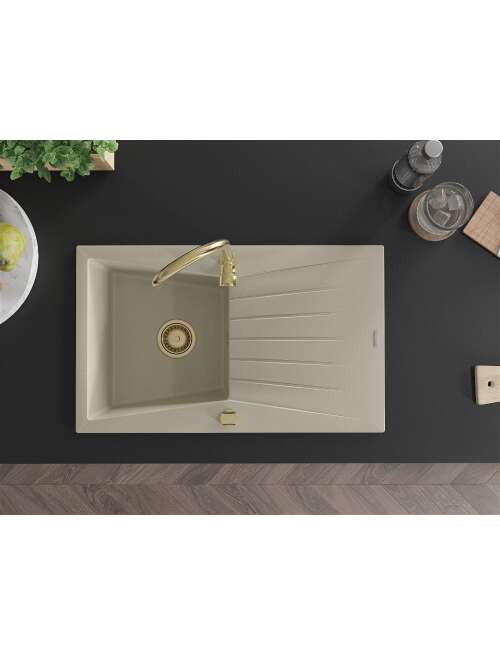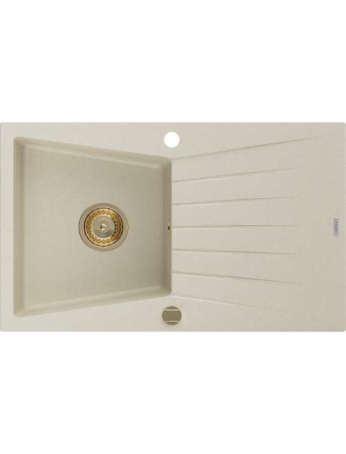 Mexen Cesar zlewozmywak granitowy 1-komorowy z ociekaczem 775 x 470 mm, beżowy, syfon złoty - 6514771010-69-G