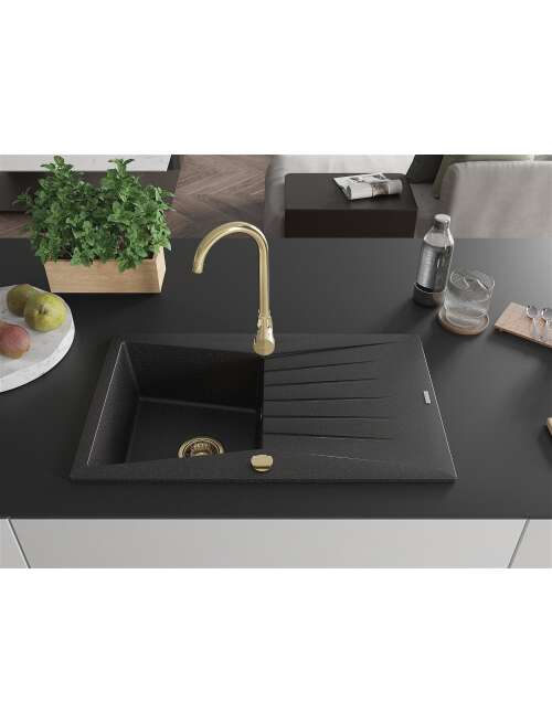 Dane techniczne: Rozmiar: 775x470x190 mm Głębokość komory: 180 mm Wymiary komory: 410x355 mm Średnica odpływu: ø90 mm Typ: 1-komorowy z ociekaczem Typ: Wpuszczany w blat Materiał: Granit Kolor: Czarny/Srebrny metalik Wykończenie syfonu: Złoty Otwór przelewowy: Tak Otwór na baterie: Tak Syfon automatyczny w komplecie Wysoka odporność na zarysowania i przebarwienia Odporność na szok termiczny Powierzchnia ułatwiająca czyszczenie |