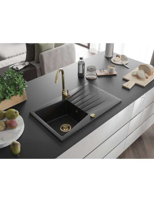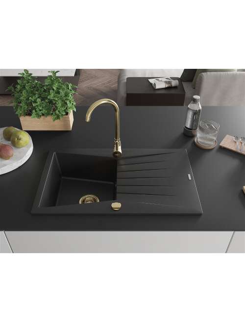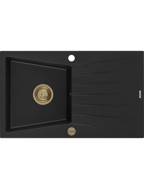 Dane techniczne: Rozmiar: 775x470x190 mm Głębokość komory: 180 mm Wymiary komory: 410x355 mm Średnica odpływu: ø90 mm Typ: 1-komorowy z ociekaczem Typ: Wpuszczany w blat Materiał: Granit Kolor: Czarny Wykończenie syfonu: Złoty Otwór przelewowy: Tak Otwór na baterie: Tak Syfon automatyczny w komplecie Wysoka odporność na zarysowania i przebarwienia Odporność na szok termiczny Powierzchnia ułatwiająca czyszczenie |