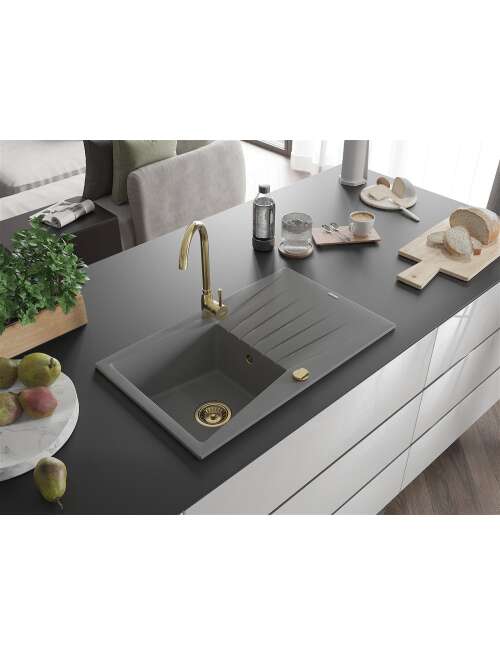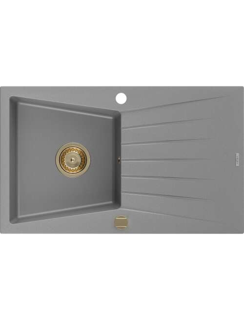Dane techniczne: Rozmiar: 775x470x190 mm Głębokość komory: 180 mm Wymiary komory: 410x355 mm Średnica odpływu: ø90 mm Typ: 1-komorowy z ociekaczem Typ: Wpuszczany w blat Materiał: Granit Kolor: Szary Wykończenie syfonu: Złoty Otwór przelewowy: Tak Otwór na baterie: Tak Syfon automatyczny w komplecie Wysoka odporność na zarysowania i przebarwienia Odporność na szok termiczny Powierzchnia ułatwiająca czyszczenie |