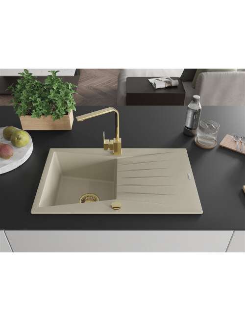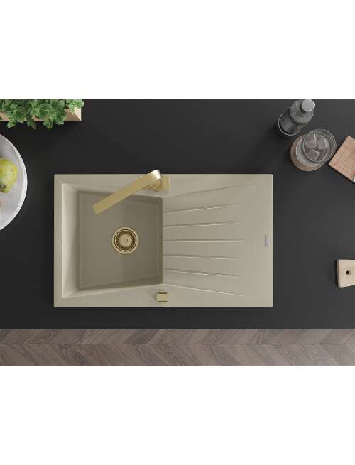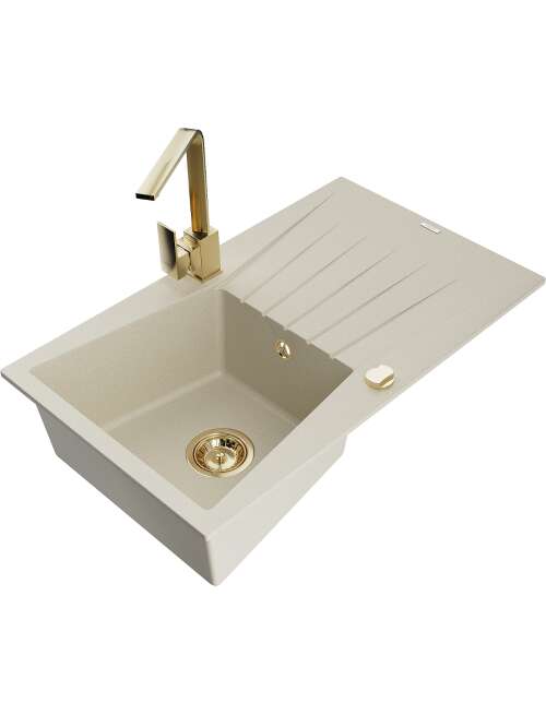 Dane techniczne: Zlewozmywak: Rozmiar: 775x470x200 mm Głębokość komory: 180 mm Wymiary komory: 410x355 mm Średnica odpływu: ø90 mm Typ: 1-komorowy z ociekaczem Rodzaj: Wpuszczany w blat Kolor: Beżowy Wykończenie syfonu: Złoty Materiał: Granit (80% kruszywo granitowe 20% żywice) Otwór przelewowy: Tak Otwory: ( bateria, automat ) 2 Montaż: Uniwersalny, możliwość montażu z ociekaczem po lewej lub prawej stronie Wysoka odporność na zarysowania i przebarwienia Odporność na szok termiczny Powierzchnia ułatwiająca czyszczenie Bateria kuchenna: Materiał: Mosiądz Kolor: Złoty Głowica: Ceramiczna Perlator: Tak Typ: Jednouchwytowa Wysokość baterii: 290 mm Zasięg wylewki: 220 mm |
