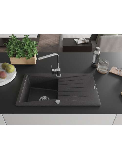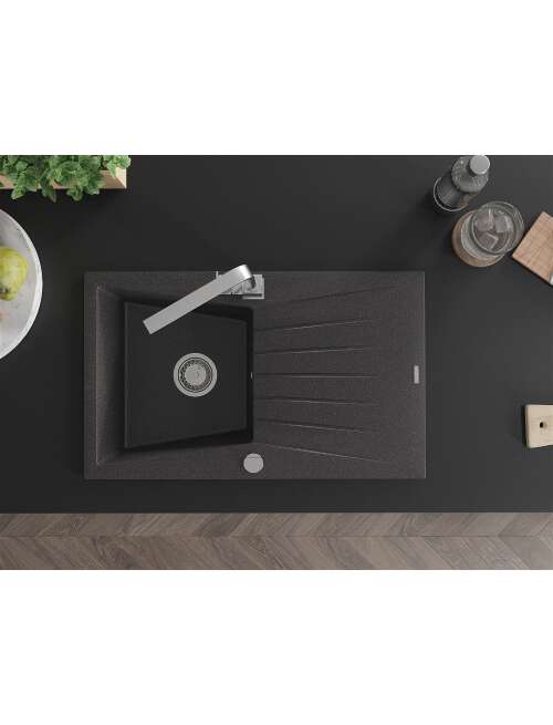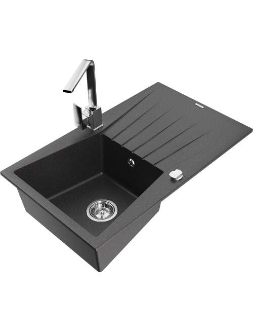 Mexen Cesar zlewozmywak granitowy 1-komorowy z ociekaczem i baterią kuchenną Rita, czarny nakrapiany - 6514-76-670300-00
