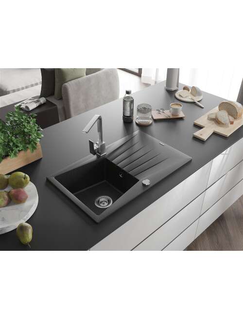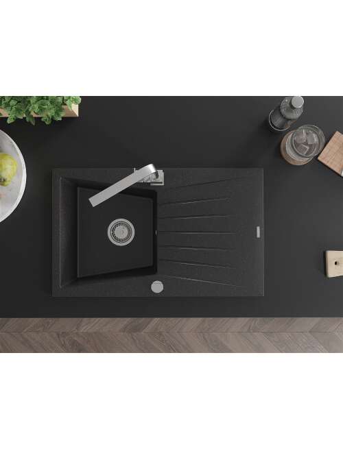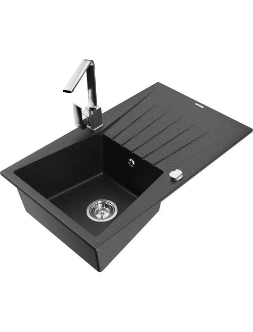 Mexen Cesar zlewozmywak granitowy 1-komorowy z ociekaczem i baterią kuchenną Rita, czarny/srebrny metalik - 6514-73-670300-00