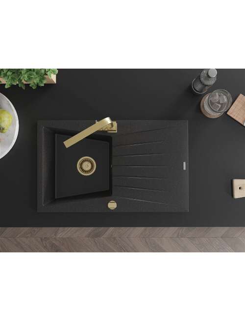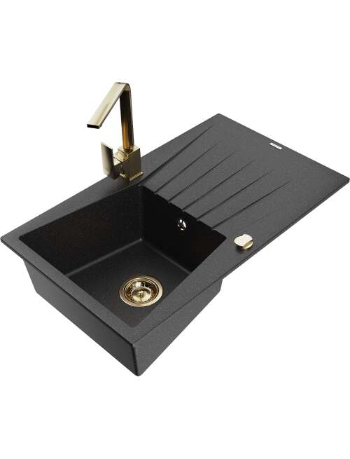Mexen Cesar zlewozmywak granitowy 1-komorowy z ociekaczem i baterią kuchenną Rita, czarny/srebrny metalik - 6514-73-670300-50