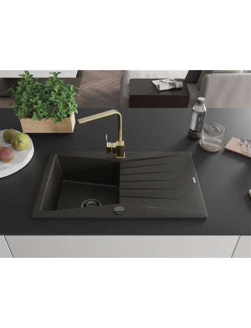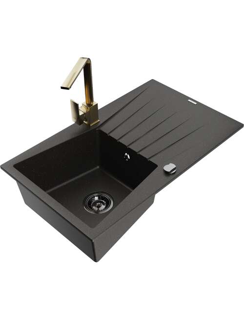 Dane techniczne: Zlewozmywak: Rozmiar: 775x470x200 mm Głębokość komory: 180 mm Wymiary komory: 410x355 mm Średnica odpływu: ø90 mm Typ: 1-komorowy z ociekaczem Rodzaj: Wpuszczany w blat Kolor: Czarny/Złoty metalik Wykończenie syfonu: Czarny Materiał: Granit (80% kruszywo granitowe 20% żywice) Otwór przelewowy: Tak Otwory: ( bateria, automat ) 2 Montaż: Uniwersalny, możliwość montażu z ociekaczem po lewej lub prawej stronie Wysoka odporność na zarysowania i przebarwienia Odporność na szok termiczny Powierzchnia ułatwiająca czyszczenie Bateria kuchenna: Materiał: Mosiądz Kolor: Złoty Głowica: Ceramiczna Perlator: Tak Typ: Jednouchwytowa Wysokość baterii: 290 mm Zasięg wylewki: 220 mm |