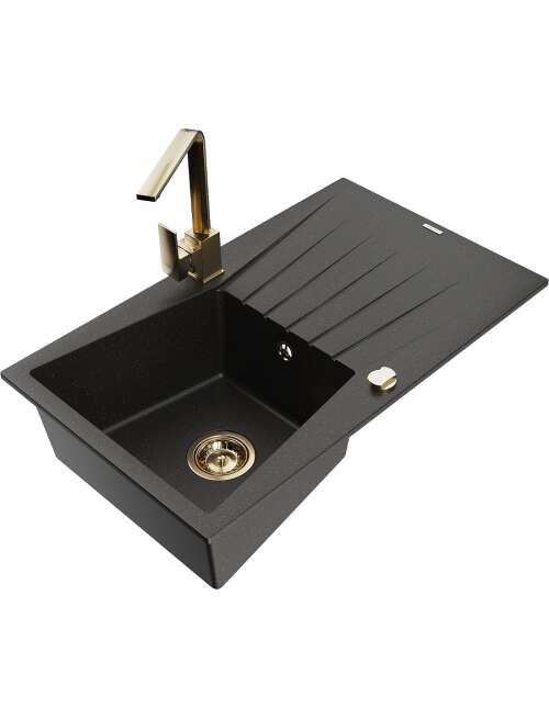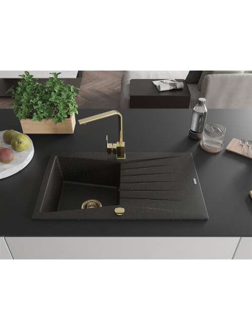 Dane techniczne: Zlewozmywak: Rozmiar: 775x470x200 mm Głębokość komory: 180 mm Wymiary komory: 410x355 mm Średnica odpływu: ø90 mm Typ: 1-komorowy z ociekaczem Rodzaj: Wpuszczany w blat Kolor: Czarny/Złoty metalik Wykończenie syfonu: Złoty Materiał: Granit (80% kruszywo granitowe 20% żywice) Otwór przelewowy: Tak Otwory: ( bateria, automat ) 2 Montaż: Uniwersalny, możliwość montażu z ociekaczem po lewej lub prawej stronie Wysoka odporność na zarysowania i przebarwienia Odporność na szok termiczny Powierzchnia ułatwiająca czyszczenie Bateria kuchenna: Materiał: Mosiądz Kolor: Złoty Głowica: Ceramiczna Perlator: Tak Typ: Jednouchwytowa Wysokość baterii: 290 mm Zasięg wylewki: 220 mm |