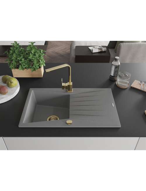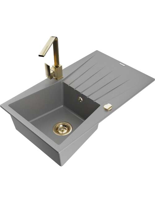 Mexen Cesar zlewozmywak granitowy 1-komorowy z ociekaczem i baterią kuchenną Rita, szary - 6514-71-670300-50