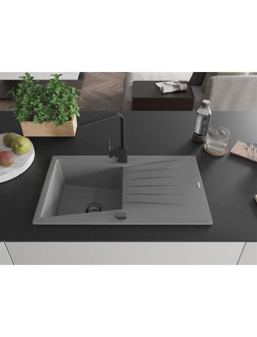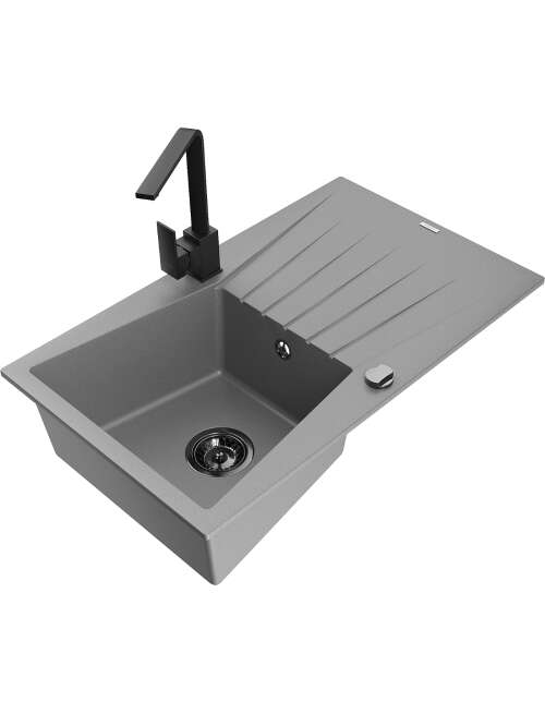 Dane techniczne: Zlewozmywak: Rozmiar: 775x470x200 mm Głębokość komory: 180 mm Wymiary komory: 410x355 mm Średnica odpływu: ø90 mm Typ: 1-komorowy z ociekaczem Rodzaj: Wpuszczany w blat Kolor: Szary Wykończenie syfonu: Czarny Materiał: Granit (80% kruszywo granitowe 20% żywice) Otwór przelewowy: Tak Otwory: ( bateria, automat ) 2 Montaż: Uniwersalny, możliwość montażu z ociekaczem po lewej lub prawej stronie Wysoka odporność na zarysowania i przebarwienia Odporność na szok termiczny Powierzchnia ułatwiająca czyszczenie Bateria kuchenna: Materiał: Mosiądz Kolor: Czarny Głowica: Ceramiczna Perlator: Tak Typ: Jednouchwytowa Wysokość baterii: 290 mm Zasięg wylewki: 220 mm |