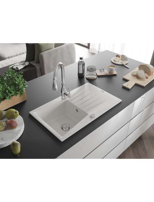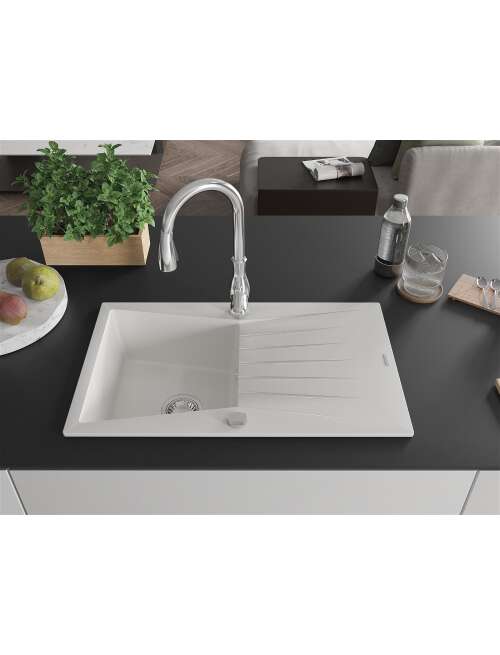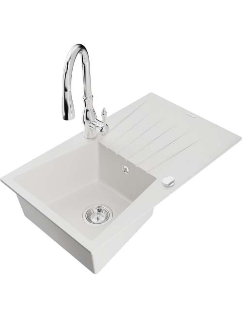 Mexen Cesar zlewozmywak granitowy 1-komorowy z ociekaczem i baterią kuchenną Savita, biały - 6513-77-672601-70