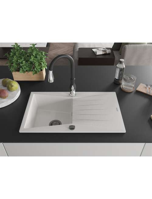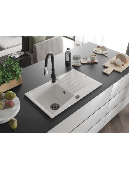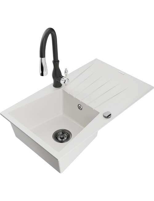 Dane techniczne: Zlewozmywak: Rozmiar: 775x470x200 mm Głębokość komory: 180 mm Wymiary komory: 410x355 mm Średnica odpływu: ø90 mm Typ: 1-komorowy z ociekaczem Rodzaj: Wpuszczany w blat Kolor: Biały Wykończenie syfonu: Czarny Materiał: Granit (80% kruszywo granitowe 20% żywice) Otwór przelewowy: Tak Otwory: ( bateria, automat ) 2 Montaż: Uniwersalny, możliwość montażu z ociekaczem po lewej lub prawej stronie Wysoka odporność na zarysowania i przebarwienia Odporność na szok termiczny Powierzchnia ułatwiająca czyszczenie Bateria kuchenna: Materiał: Mosiądz Kolor: Czarny Głowica: Ceramiczna Perlator: Tak Typ: Jednouchwytowa Wysokość baterii: 410 mm Zasięg wylewki: 231 mm |