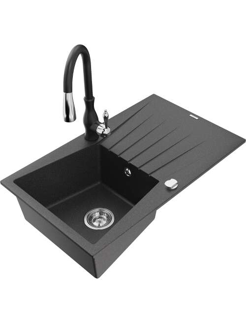 Dane techniczne: Zlewozmywak: Rozmiar: 775x470x200 mm Głębokość komory: 180 mm Wymiary komory: 410x355 mm Średnica odpływu: ø90 mm Typ: 1-komorowy z ociekaczem Rodzaj: Wpuszczany w blat Kolor: Czarny nakrapiany Wykończenie syfonu: Chrom Materiał: Granit (80% kruszywo granitowe 20% żywice) Otwór przelewowy: Tak Otwory: ( bateria, automat ) 2 Montaż: Uniwersalny, możliwość montażu z ociekaczem po lewej lub prawej stronie Wysoka odporność na zarysowania i przebarwienia Odporność na szok termiczny Powierzchnia ułatwiająca czyszczenie Bateria kuchenna: Materiał: Mosiądz Kolor: Czarny Głowica: Ceramiczna Perlator: Tak Typ: Jednouchwytowa Wysokość baterii: 410 mm Zasięg wylewki: 231 mm |